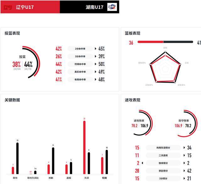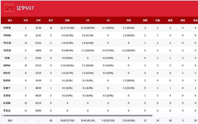 从数据来看,辽宁U17男篮打得确实不咋地,投篮命中率只有37.5%,三分球19投5中,命中率26.3%,湖南队命中率43.6%,三分球18投7中,命中率38.9%。辽宁队失误多达20次,而湖南队仅8次。篮板球36-41,辽宁队也是落后的。