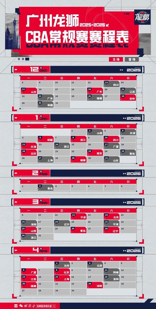 前行无畏 | 广州龙狮2025-2026赛季CBA联赛常规赛 赛程图