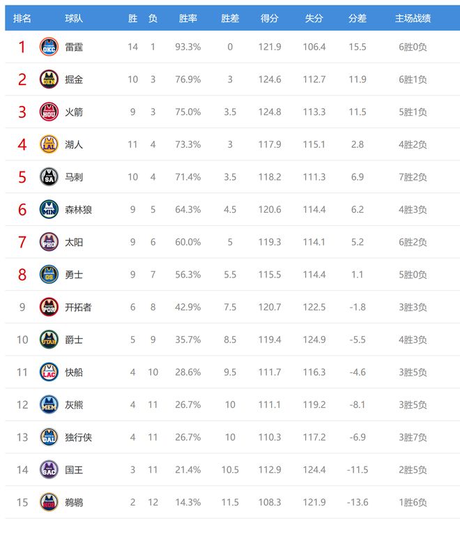 今日比赛后太阳、勇士排名互换,快船、灰熊排名互换,其他球队排名不变。
