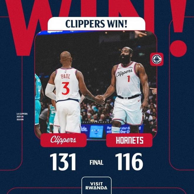 NBA战报:快船131-116黄蜂,哈登55+3+7