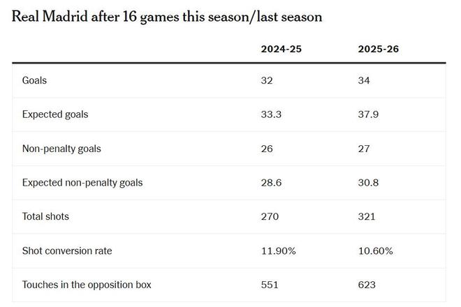 如下表所示,实际上今年在阿隆索的带领下,皇马产生的预期进球值比去年更高,总进球和非点球进球也更多。但他们的射门转化率却下降了,尽管在对手禁区内的触球次数和射门次数都比上赛季多。