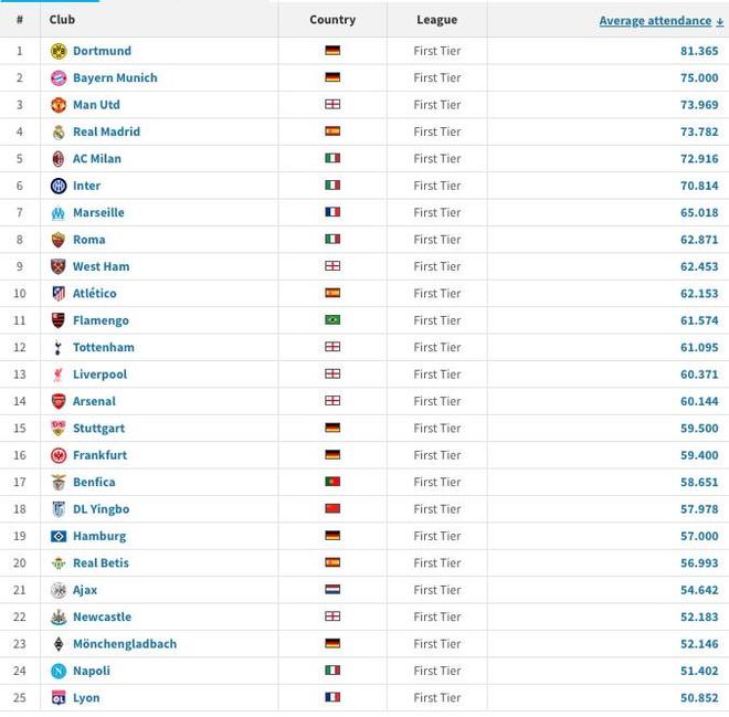 德转本赛季全球主场场均上座TOP25:多特拜仁前二,英博第18