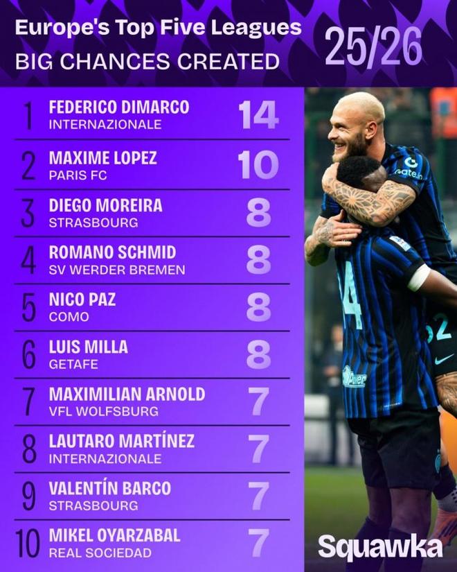 Squawka统计了本赛季球员在五大联赛创造重大机会的次数,并列出榜单,迪马尔科创造14次重大机会最多。
