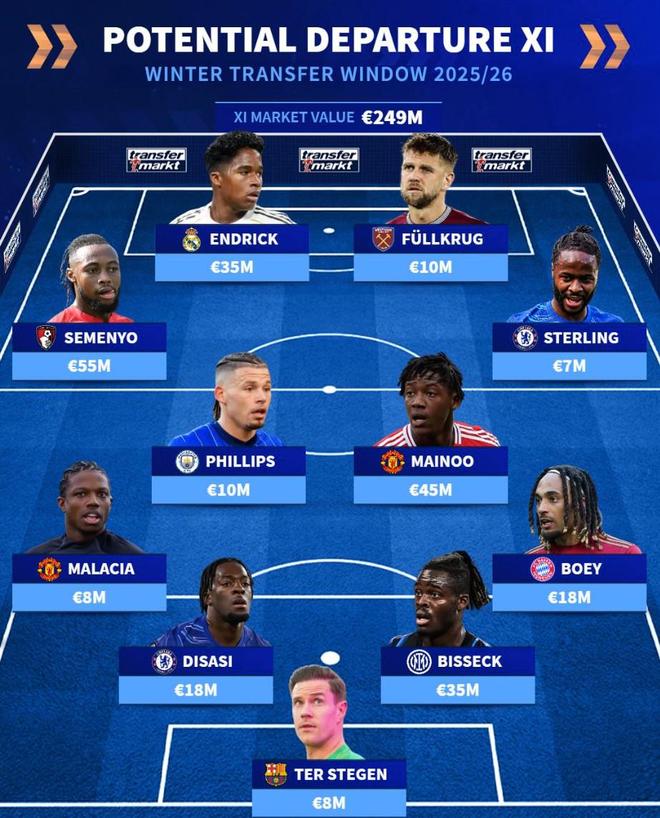斯特林(切尔西)700万欧元、梅努(曼联)4500万欧元、卡尔温-菲利普斯(曼城)1000万欧元、塞门约(伯恩茅斯)5500万欧元