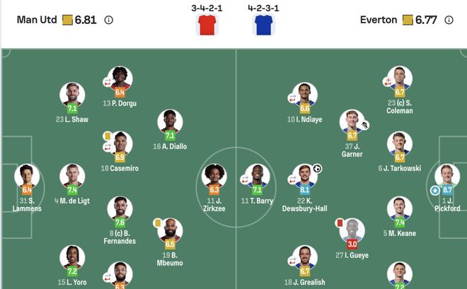 曼联(3421):31-拉门斯;15-约罗,4-德里赫特,23-卢克肖;3-马兹拉维(46‘7-芒特),18-卡塞米罗(58‘37-梅努),8-B费,13-多古(59‘2-达洛特);18-姆伯莫,16-迪亚洛;11-齐尔克泽