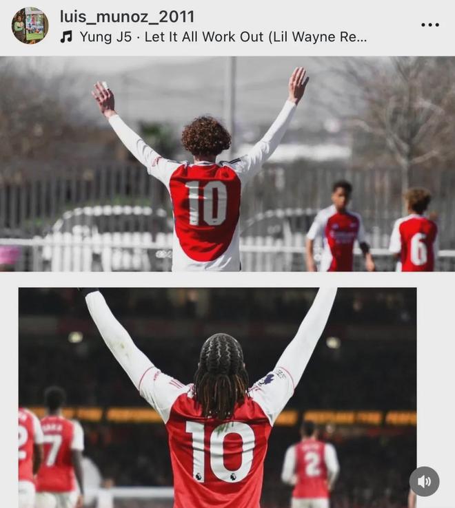 阿森纳青训小将路易斯-穆尼奥斯IG:@埃泽,我梦想有一天也能像你做到的那样。